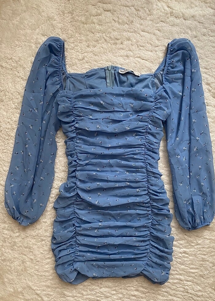 Çiçek desenli yanları drapeli mini tül elbise. Kolları hariç iç göstermez. Fermuarlıdır XS-S-M beden için uygundur. Kullanılmadı