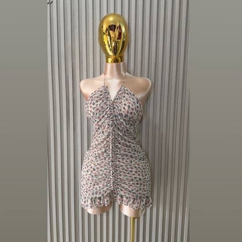 Drapeli ve straplez yaka olan bu mini elbise, hafif çok renkli çicek desenine sahip ve parti için uygundur. İlk iki görsel bana ait değildir.