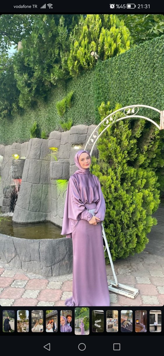 Drapeli, yüksek yakalı ve bol kesim mor uzun abiye. Pastel tonu ve etnik desenleriyle sade ve şık bir düğün elbisesi. Hiç bir defosu yok bir kere giyildi isteyene ayrıntılı fotoğraf atacağım