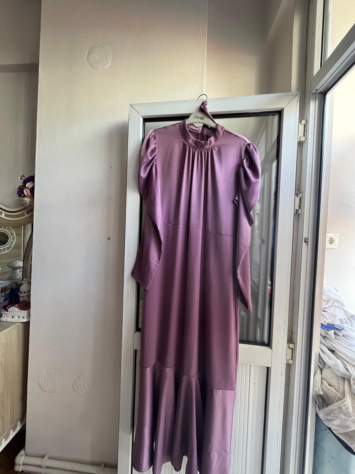 Mor renkli, uzun kollu ve yüksek yakalı bu kadın elbisesi, ipeksi kumaştan olup, drapeli ve bol kesimdir. Günlük kullanıma uygundur.