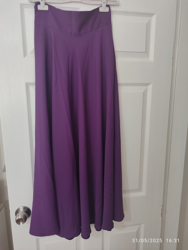 Diger markanın mor, drapeli, uzun ve bol kesim kadın eteği. Ofis için minimal ve sade bir tarz sunar. Düz desensiz, ipeksi dokulu kumaş. Marka:Florya Renk:Mor Beden:40 Mevlana model kloş etek 164 boy 62 -65 kiloda giyilmiştir.