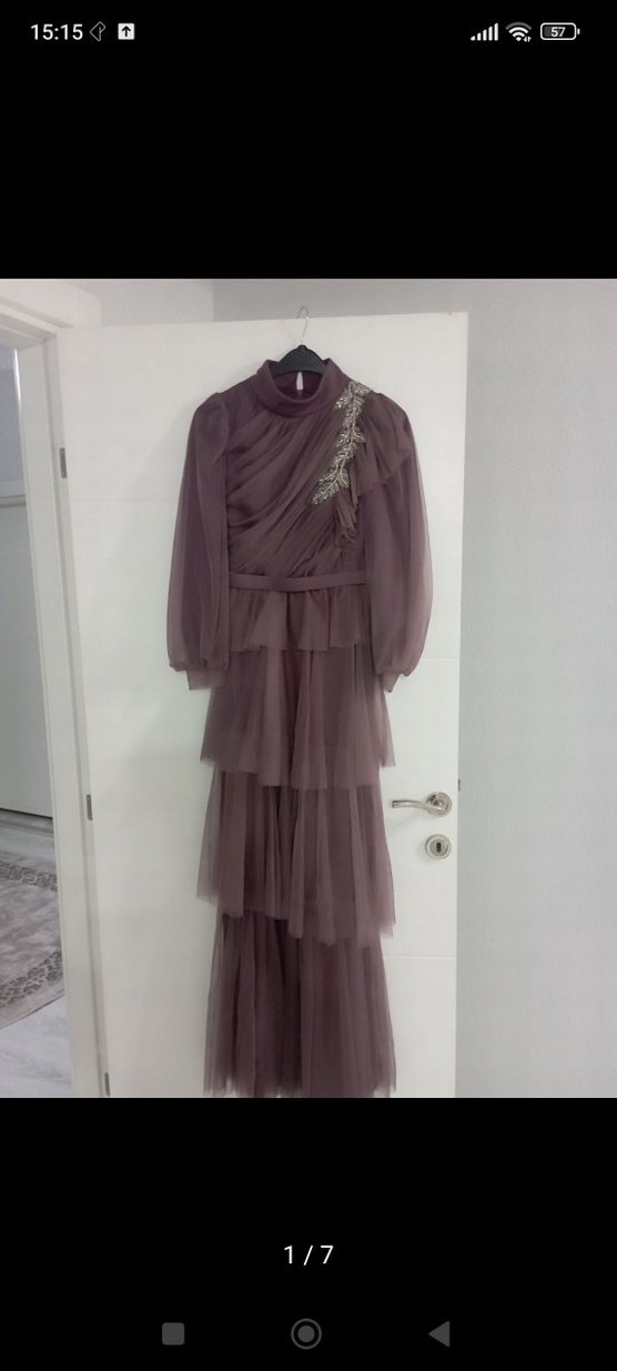 Yüksek yakalı, uzun kollu ve drapeli katmanlara sahip, işlemeli detaylı mor uzun abiye elbise. ✨166 boyunda 44 kiloda giyildi