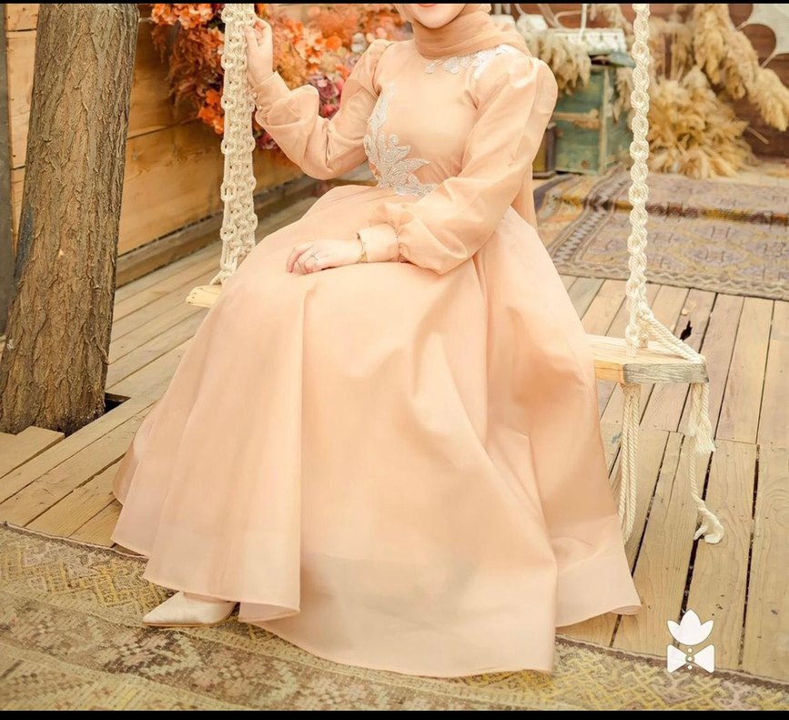Bej renkte, yüksek yakalı, uzun kollu ve bol kesim drapeli nakış detaylı uzun elbise, düğünler için uygundur.