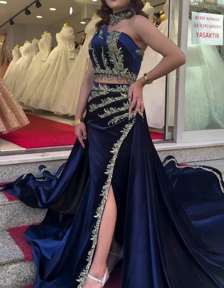 Drapeli ve nakış detaylı, straplez, vücuda oturan lacivert parlak kumaş abiye elbise. Kolsuz ve şık yırtmaçlı tasarım. ✨