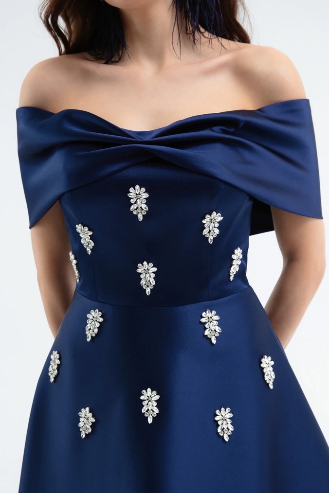 Ütülendiği takdirde fotoğraftaki gibidir bir kere giyildi Lacivert renkli, drapeli kayık yaka ve nakış detaylı abiye elbise. Parlak dokusu, kolsuz ve regular fit kesimiyle düğünler için uygundur. ✨