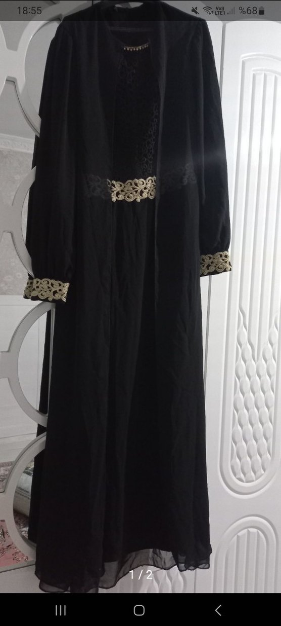 Siyah uzun elbise, drapeli ve nakışlı detaylara sahip, bol kesim ve uzun kolludur. Yüksek yakasıyla mütevazı, gotik tarzda düğünler için uygundur.