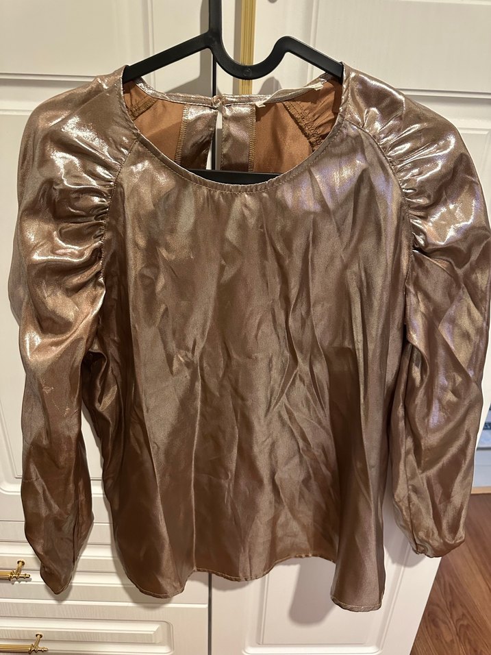 Parlak kahverengi deri bluz, uzun kollu ve drapeli tasarıma sahip. Yuvarlak yaka ve bol kesim, midi uzunlukta günlük sokak tarzı için uygun. ✨ #zara #mango #hm