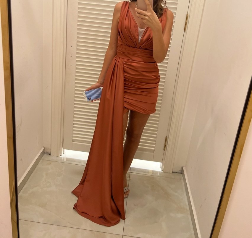 Parlak kahverengi kumaştan, drapeli ve V yaka tasarımlı, askılı, uzun ve vücuda oturan abiye elbise.