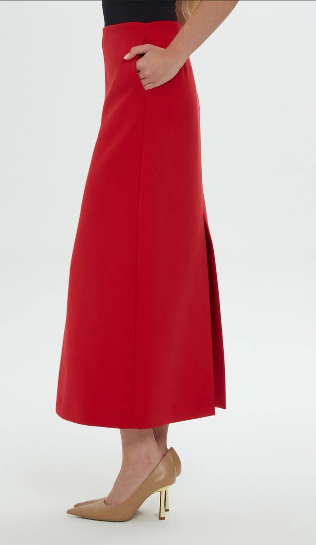 Parlak kırmızı renkte, drapeli ve uzun kesim kadın eteği. Sentetik kumaştan, minimal sokak stili için uygun, romantik akşamlar için ideal.Önden derin yırtmaçlı ❤️