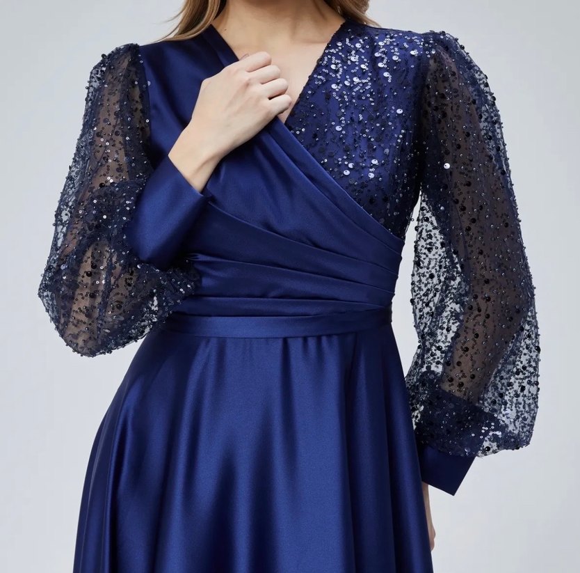 V yaka, drapeli ve dar kesim lacivert uzun abiye elbise. İşlemeli, parlak ve tül uzun kollara sahiptir, düğün için uygundur. ✨Abiye tertemizdir,hiçbir kusuru yoktur.Nikah da sadece 1 saatliğine giyilmiştir.