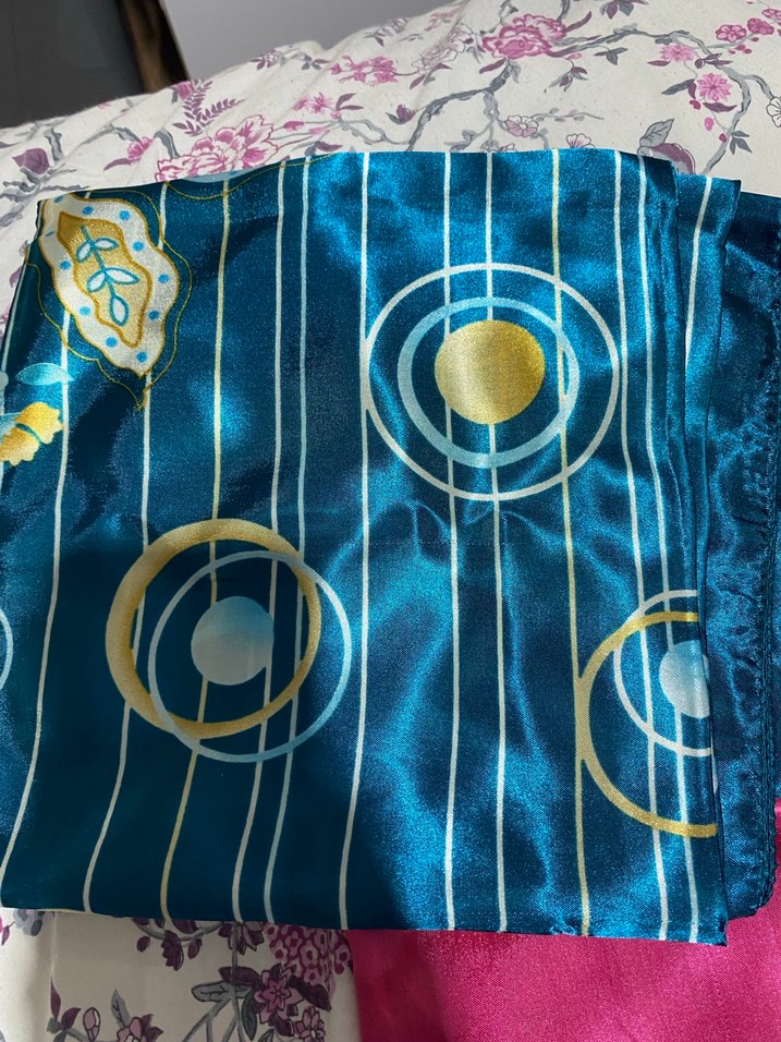 Parlak mavi renkte, dairesel ve çizgisel desenlere sahip, drapeli tasarımlı, yumuşak sentetik kumaştan yapılmış kadın saten şal