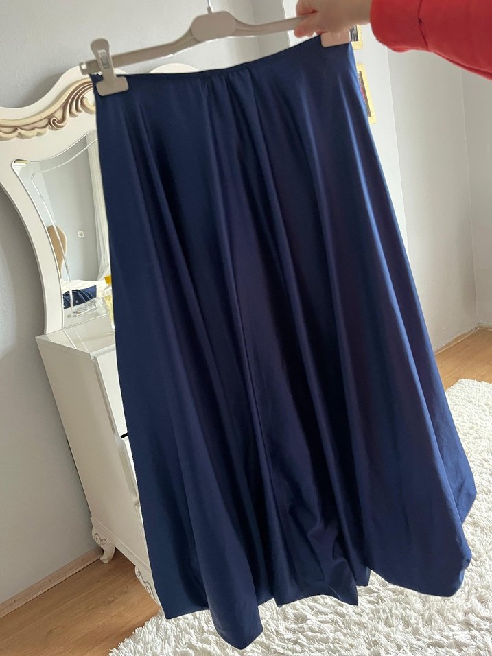 Parlak mavi renkte, ipeksi kumaştan, drapeli ve bol kesim uzun kadın eteği. Ofis için uygundur. ✨