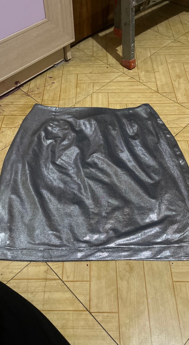 Parlak siyah deri, drapeli tasarımlı, vücuda oturan mini etek. Gotik tarz için uygundur.