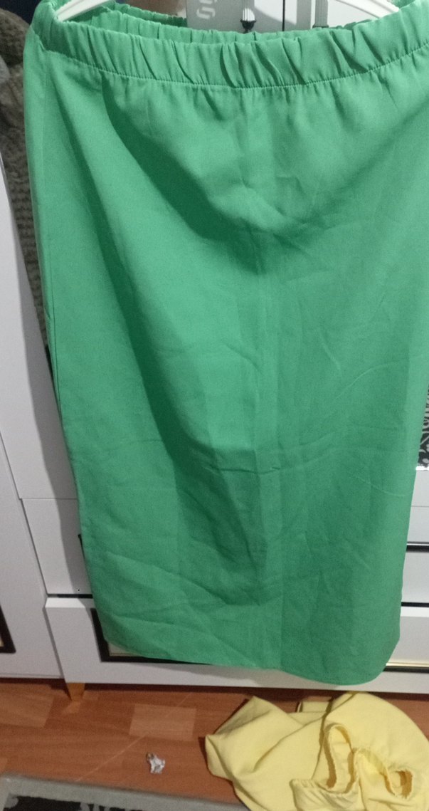 Drapeli tasarıma ve parlak yeşil renge sahip uzun etek, sentetik kumaştan üretilmiş ve rahat bir kesime sahiptir. Dış mekan kullanımı için uygundur.