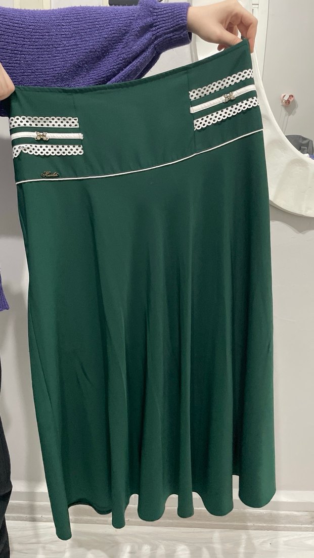 Drapeli tasarıma sahip parlak yeşil uzun etek, beyaz şerit detaylarıyla klasik ve rahat bir görünüm sunar.