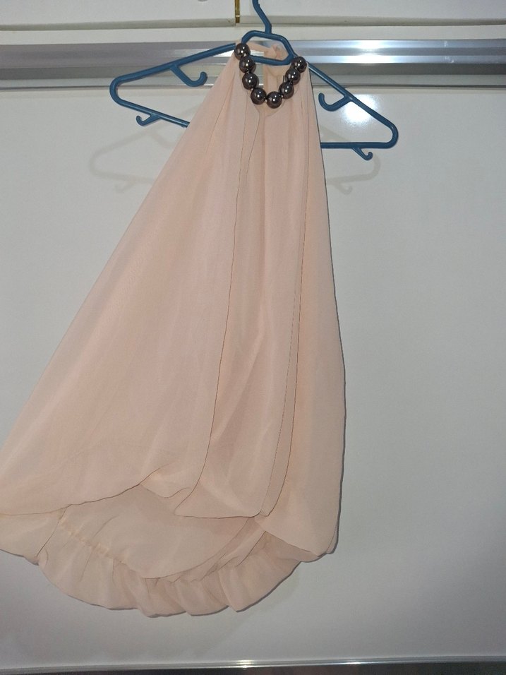 Bej renkte, yüksek yakalı ve kolsuz, drapeli ve bol kesim hamile . İpek gibi kumaştan, bohem tarzda, düğün için uygun.
