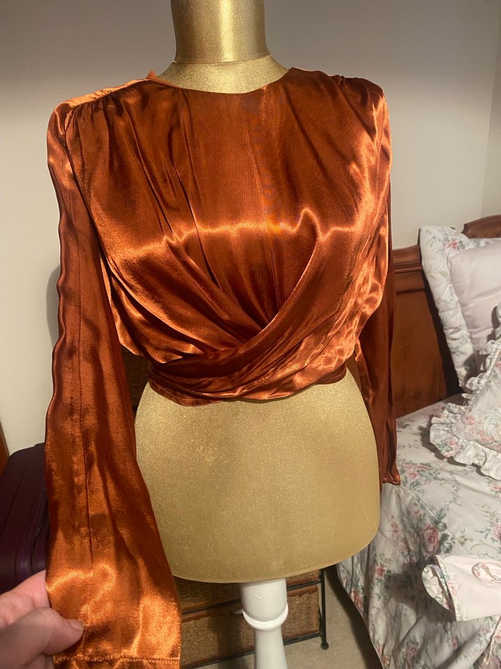 ,saten dokulu, drapeli, uzun kollu, yüksek yakalı, vücuda oturan bohem tarzda kadın bluz.Arka veya ön bağlamalı