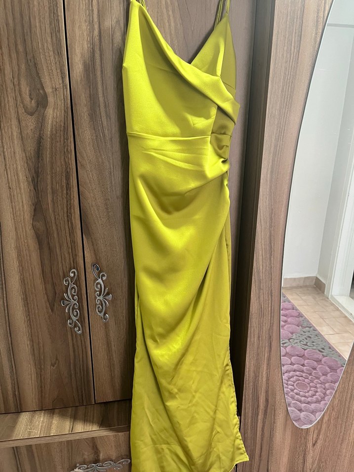 Drapeli Saten Yağ yesili Uzun Kadın Elbise