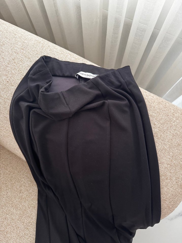 Uzun, siyah hamile eteği, drapeli tasarımı ve rahat kesimiyle yumuşak sentetik kumaştan üretilmiştir, günlük sokak stili için uygundur.