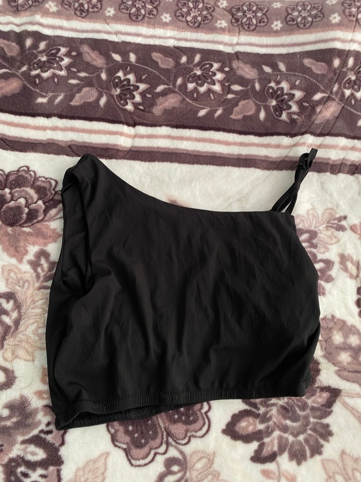 Siyah askısız bustiyer, sentetik kumaştan, drapeli ve bol kesimlidir. Günlük kullanım için minimalist ve sokak tarzına uygundur.