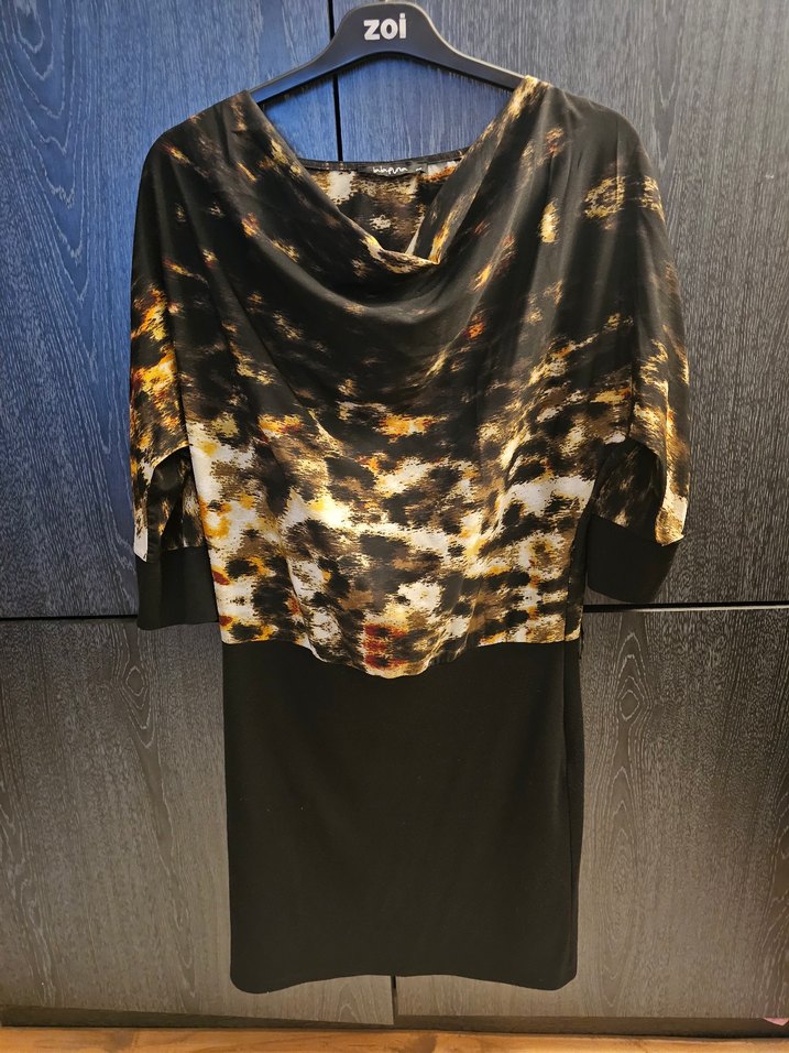 Drapeli, kayık yaka ve kısa kollu elbise. Üst kısmı koyu batik desenli, alt kısmı düz siyah, yumuşak sentetik kumaştan. Günlük kullanıma uygun, çağdaş avant-garde tarzda.