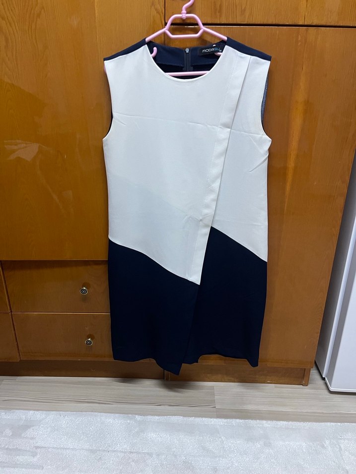 Kolsuz, midi boy, regular fit elbise. Siyah beyaz renklerde, sentetik kumaştan, drapeli tasarıma sahip.