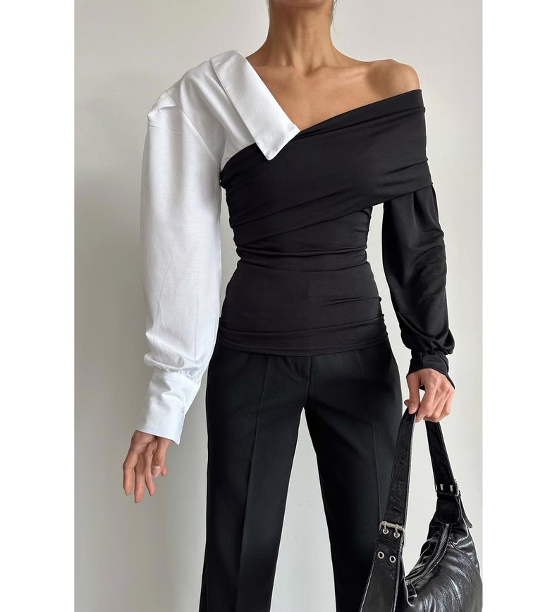Avant-garde tarzda, siyah-beyaz renklerde, drapeli ve straplez yakalı, uzun kollu, midi boy, regular fit bluz. Ofis için uygun, çağdaş tasarım.