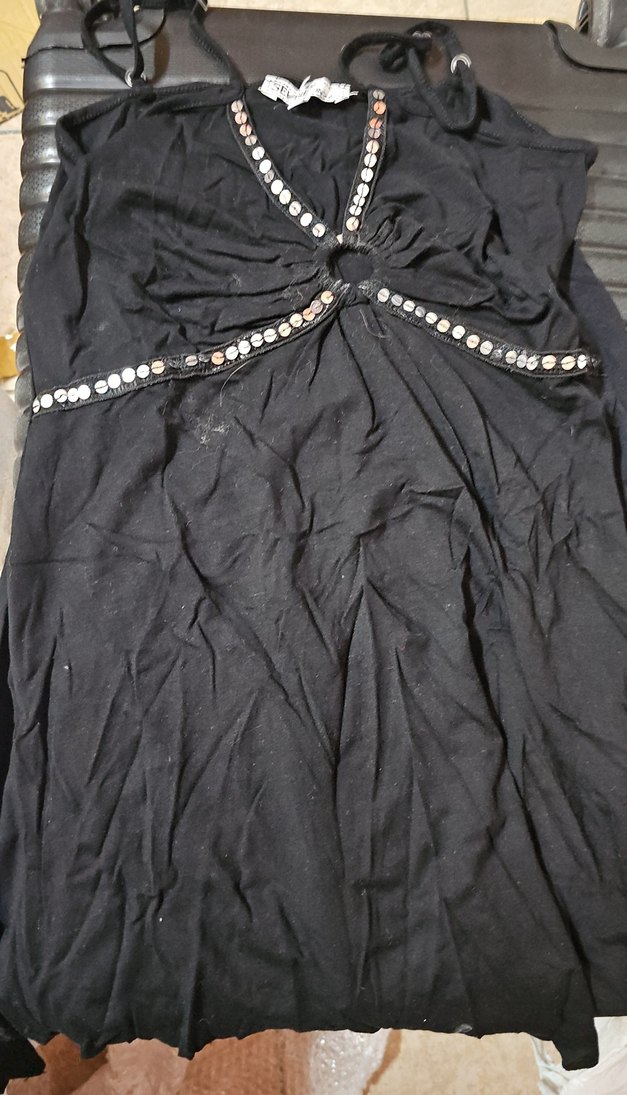 Siyah, kolsuz, v yaka salaş uçlu bluz. Drapeli ve taş süslemeli, vücuda oturan kesim. Parti için uygun.