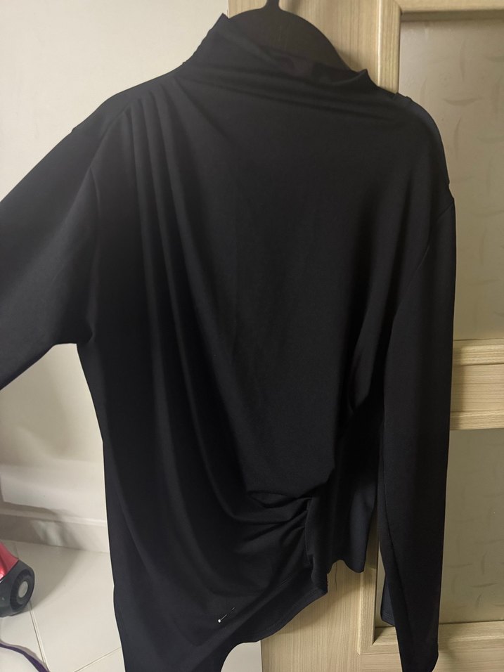 Siyah boğazlı kadın bluz, uzun kollu ve drapeli detaylıdır. Salaş kesimi ve midi boyu ile ofis için uygundur.