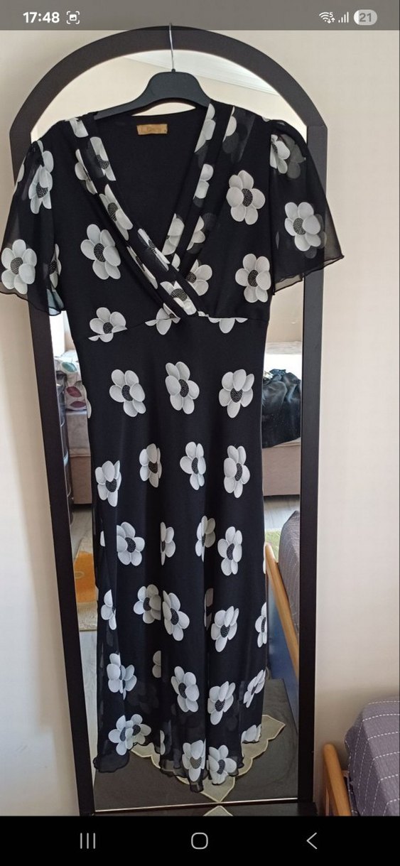 Drapeli V yaka, kısa kollu, bol kesim uzun siyah elbise, büyük beyaz çiçek baskılı, gotik ve bohem tarzı yansıtır.