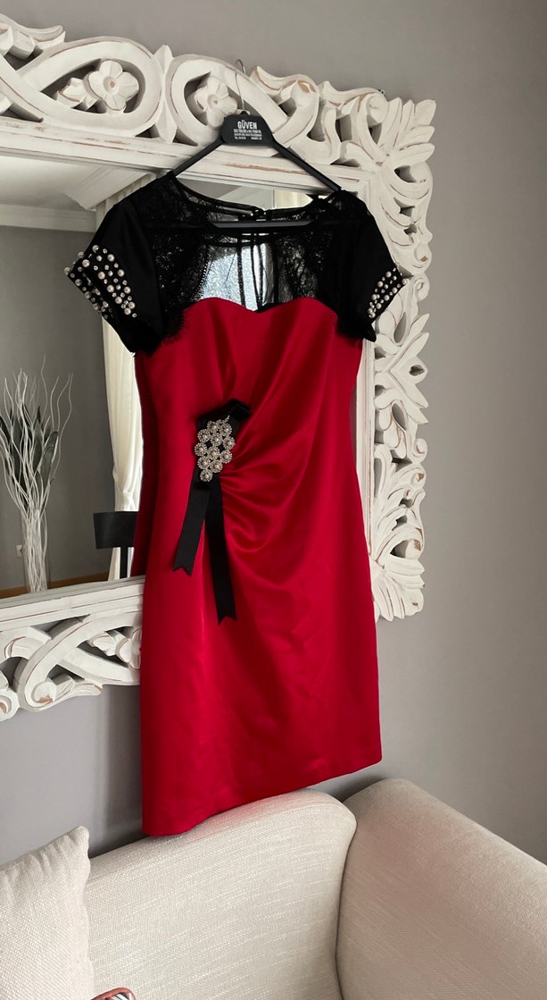 Drapeli kırmızı midi elbise, siyah dantel kısa kollu ve broş süslemeli, gotik ve klasik şıklığı birleştirir. Romantik akşamlar için ideal.