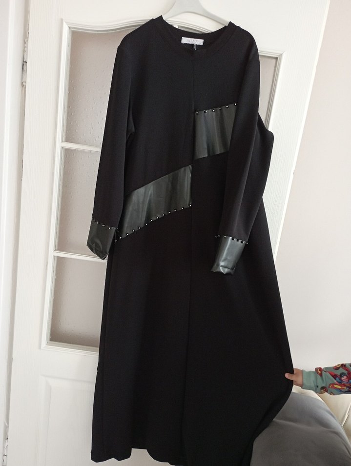 Siyah uzun elbise, deri detaylar ve drapeli tasarımıyla, uzun kollu ve bol kesimli olarak sunuluyor. Yuvarlak yaka ile tamamlanmıştır.kalin penye kumaş,sıfır üründür defo vs yok