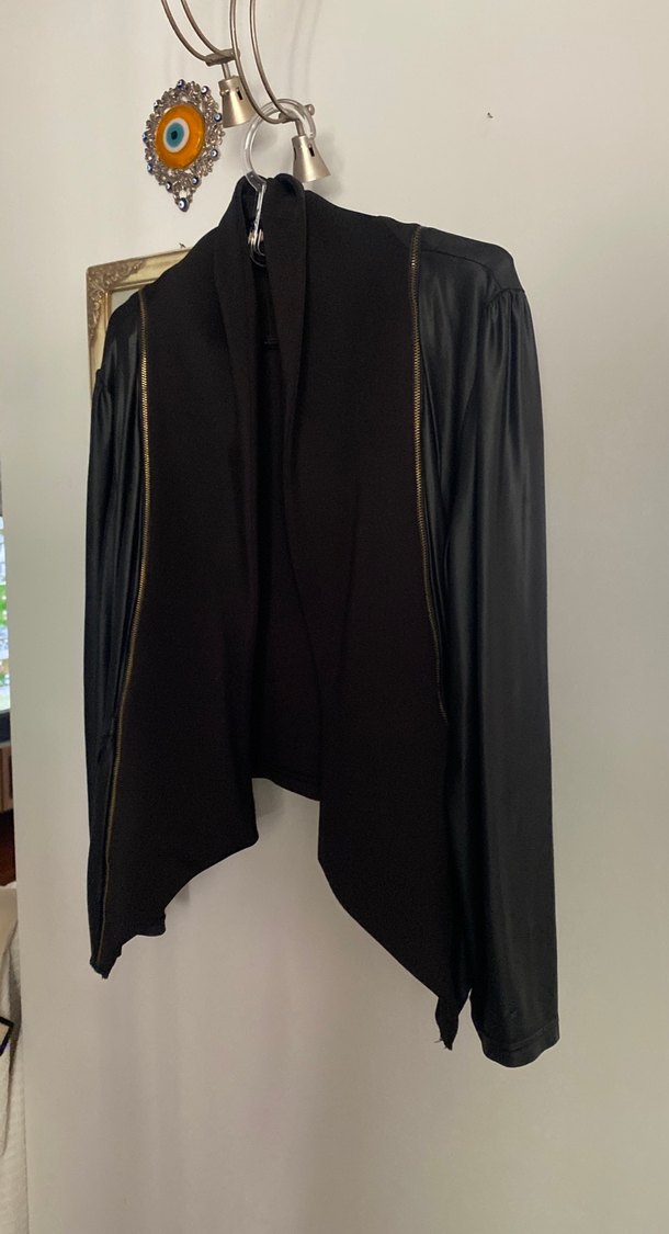 Drapeli tasarıma sahip siyah deri ceket, yakası kesik ve uzun kolludur. Normal uzunlukta, regular fit ve ofis kullanımı için uygundur.