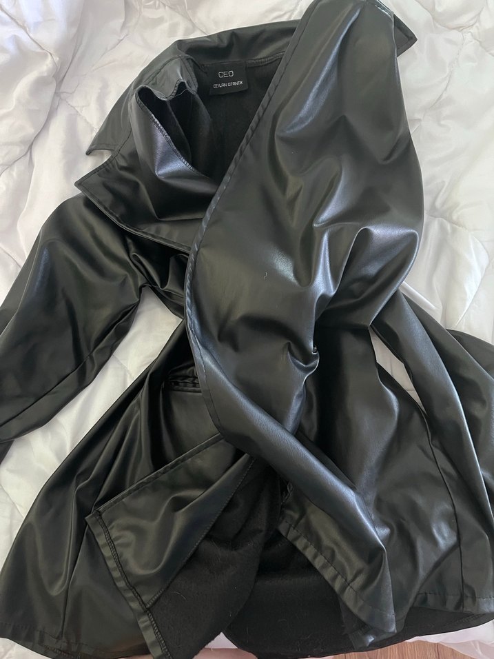 Drapeli tasarımı, kesik yaka ve askılı kollara sahip siyah deri ceket. Avant-garde goth tarzı için uygun, long boyda ve desen içermeyen şık bir model.
