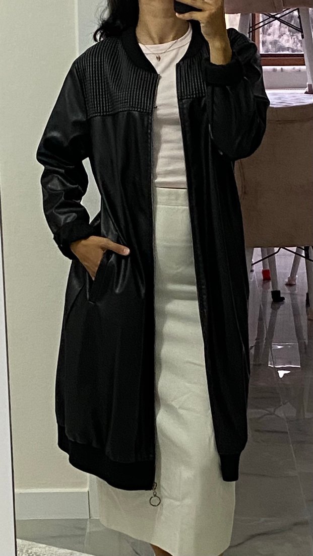 Drapeli tasarıma sahip siyah deri uzun ceket, kesik yaka ve uzun kollu regular fit ile günlük sokak stiline uygundur.