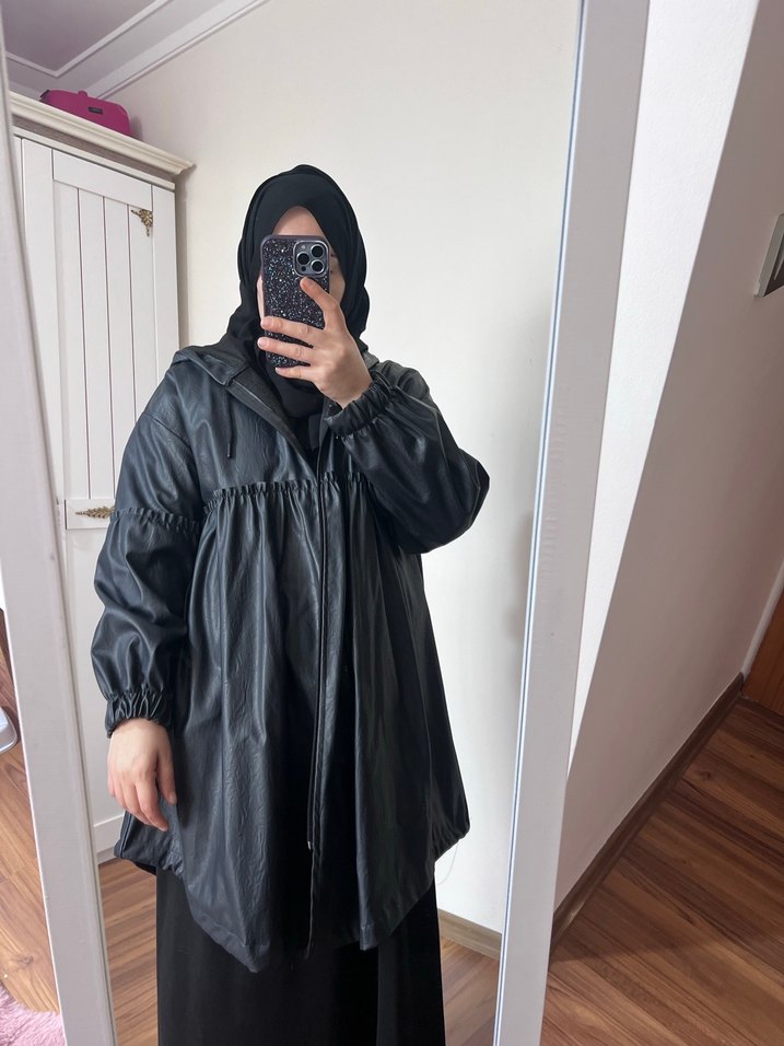 Drapeli detaylara ve yüksek yakaya sahip, bol kesim siyah deri yağmurluk. Uzun kollu ve midi boyda, günlük kullanıma uygun.Laciver renktir.