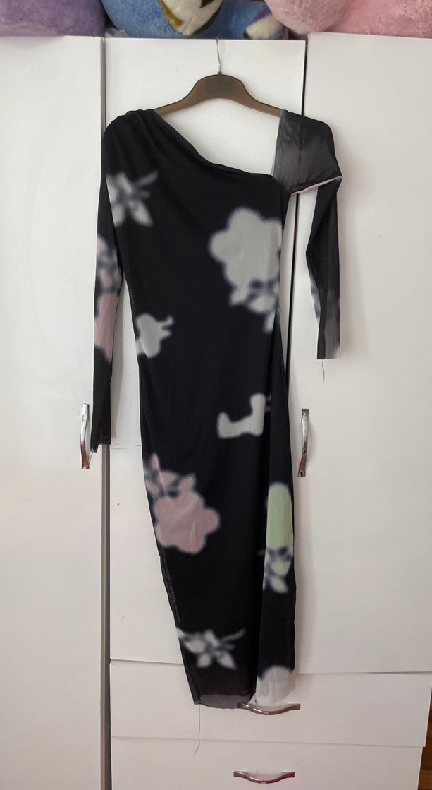 Drapeli detaylı, desenli koyu renk uzun elbise. Uzun kollu ve tek omzu düşük tül elbise