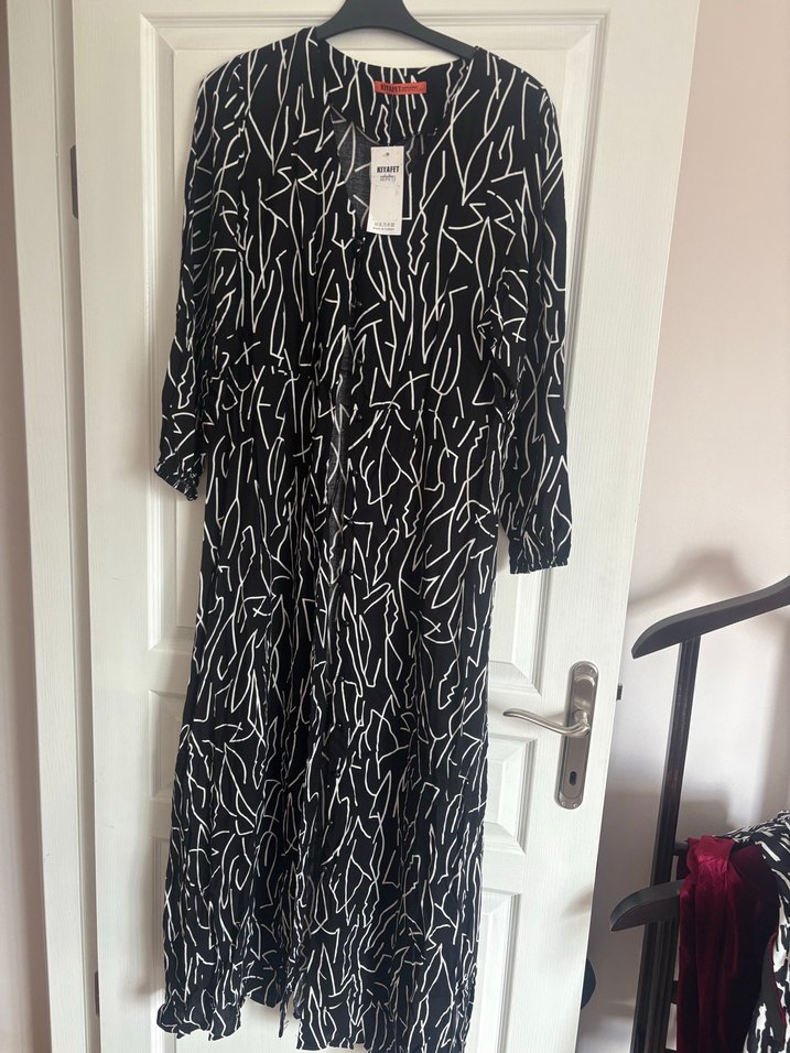Siyah, desenli, drapeli, V yakalı, uzun ve bol kesim elbise. Sentetik kumaştan, askılı kollu, sokak modasına uygun.