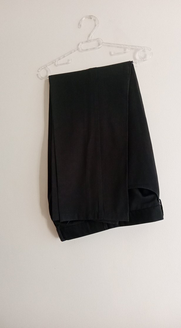 Siyah, ipeksi kumaştan, regular fit ve midi boyda, drapeli tasarıma sahip erkek kumaş pantolon. Ofis için uygun, minimalist ve sokak stilinde. iki kere giyildi boy 100 bel 86 paça 20