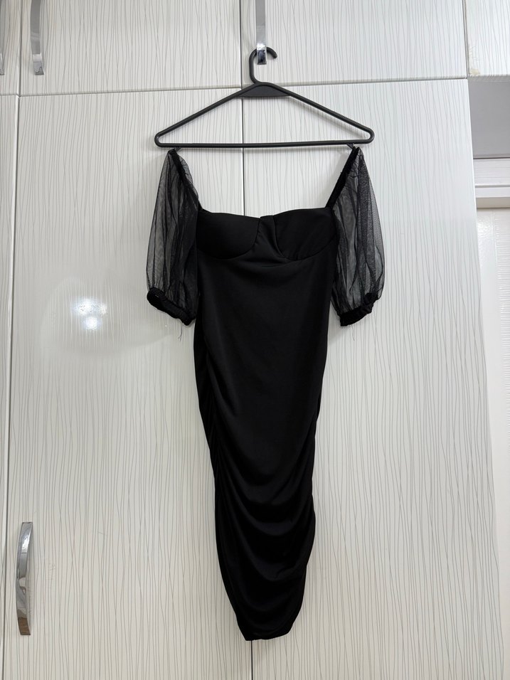Siyah, straplez yakalı ve transparan askılı kollu, drapeli ve vücuda oturan uzun abiye elbise. Gotik ve avangart tarzda, parti için uygun.