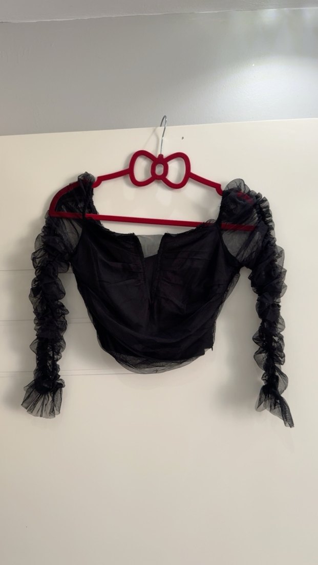 Drapeli ve askılı uzun kollu, tekne yaka siyah bluz. Yumuşak sentetik kumaştan, parti için uygun.etiketli ürün