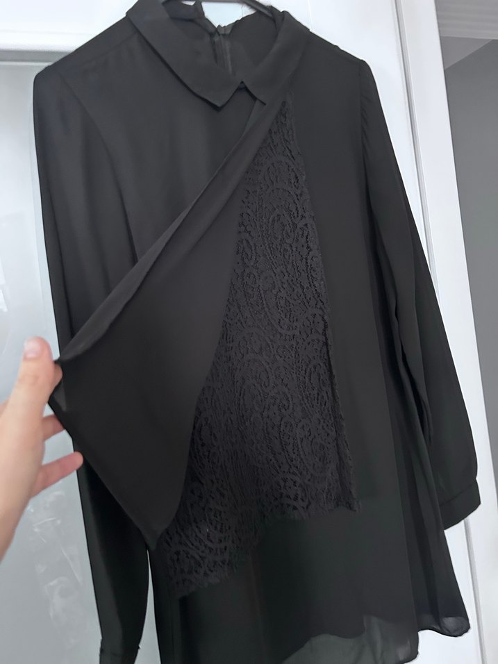 Siyah, drapeli, uzun kollu gotik bluz. Yüksek yaka ve midi boy. Ofis için uygun, ipeksi dokulu, sade ve rahat kesim.