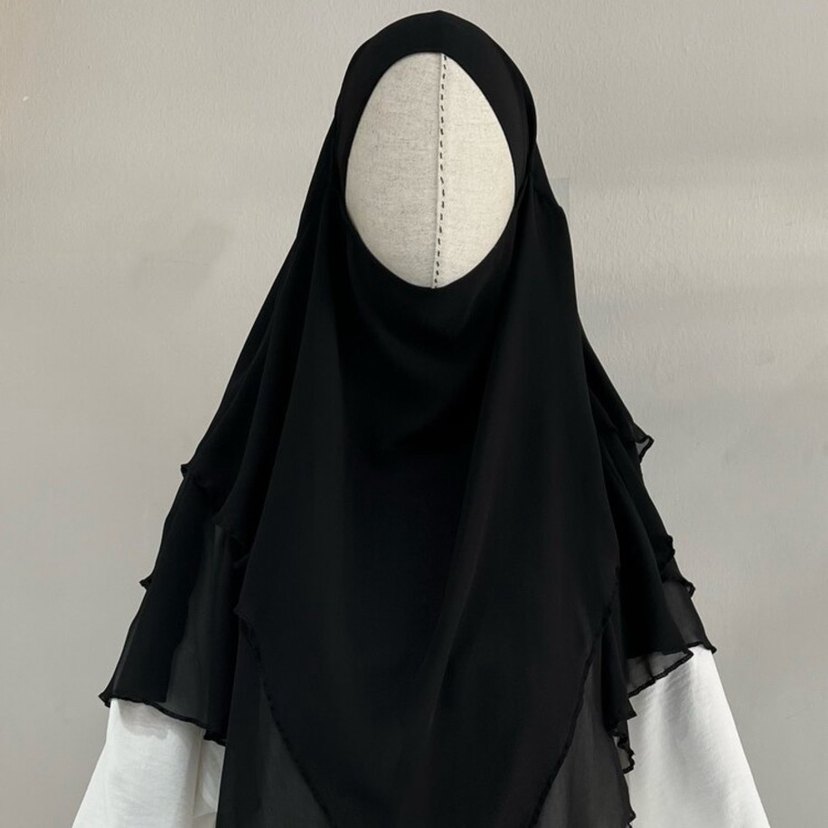 Drapeli siyah kadın başörtüsü, modest ve gotik tarzda multi şifon kumaştan üretilmiştir. Koyu ve şık bir görünüm sunar.