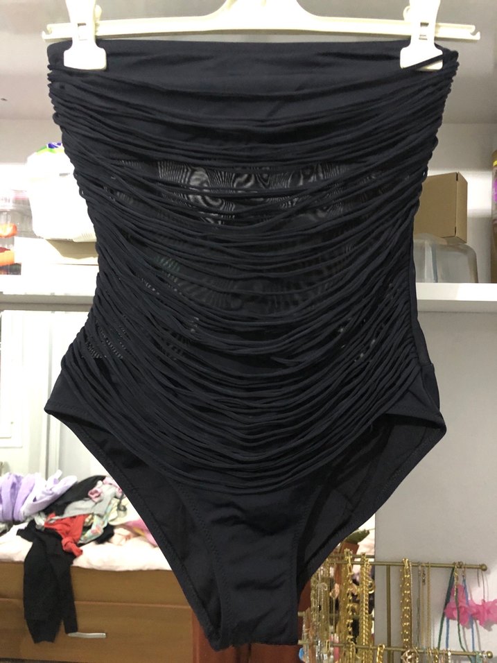 Drapeli ve askılı detaylı, siyah, vücuda oturan bu mayo, cesur ve gotik tarzı yansıtır. Midi boy ve desenlidir, parti için uygundur. L beden m bedenede uygun