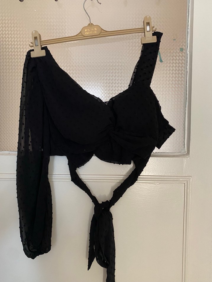 Tek kollu askılı, drapeli siyah gotik mini bluz, halter yakalı ve vücuda oturan kesime sahiptir. Romantik buluşmalar için uygundur.