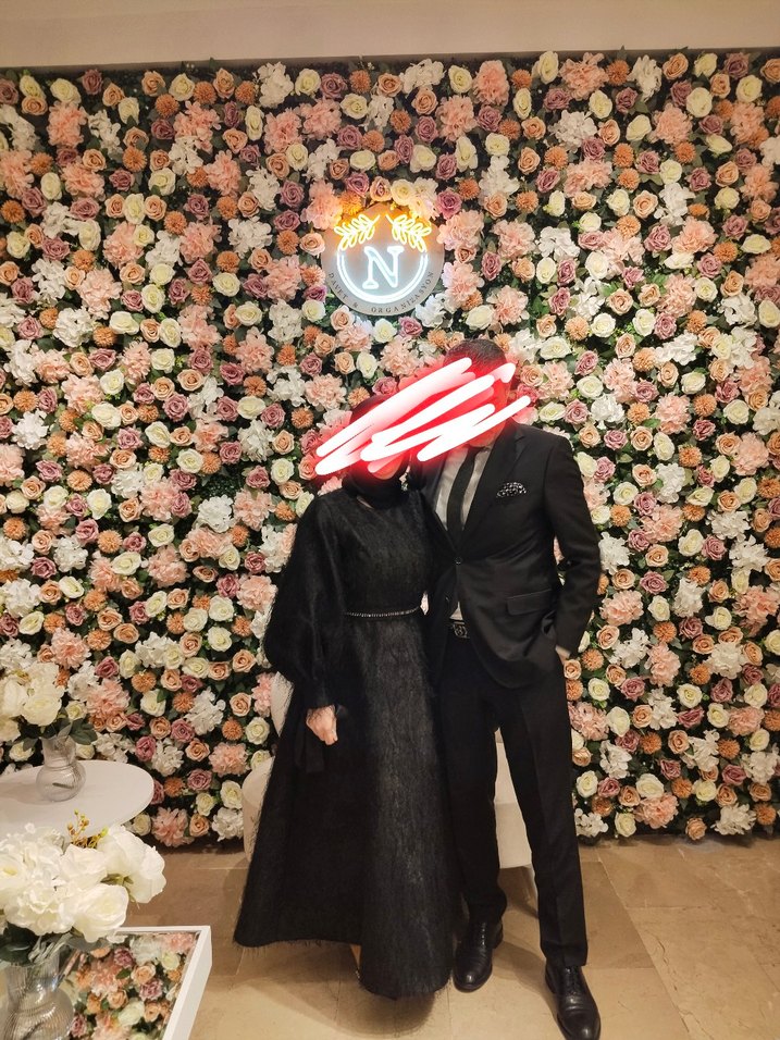 Drapeli, siyah çiçek desenli, strappy kollu ve yakalı, modest gotik tarzda, uzun ve vücuda oturan nişan elbisesi.