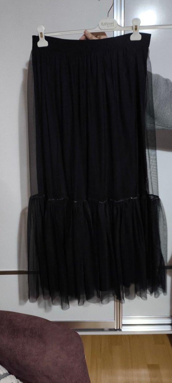 Sentetik kumaştan, drapeli detaylı ve tül katmanlı uçlu, siyah uzun ve dar kesim gotik etek. günlük kullanımı için uygun.