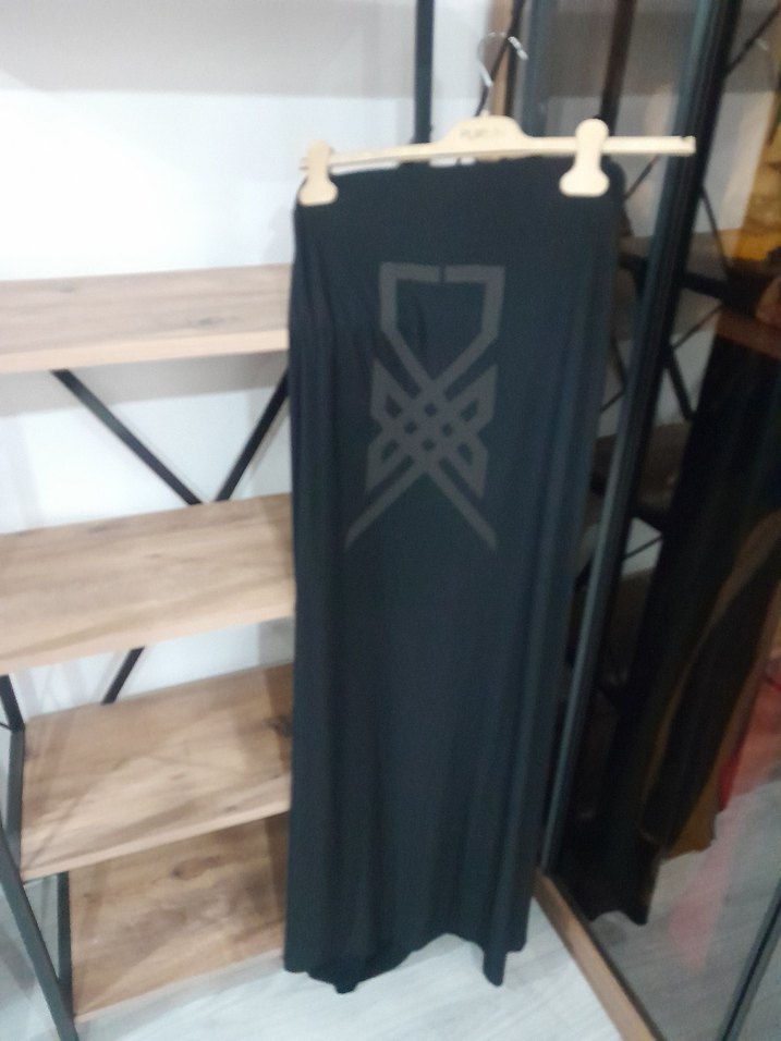 Sentetik kumaştan yapılmış, drapeli ve baskılı gotik desene sahip, fit kesim siyah uzun etek. Dış mekan kullanımı için uygundur, şık ve avangart tarzda.