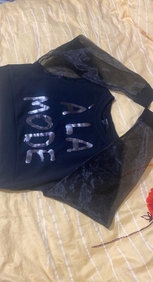 Drapeli uzun kollu, yuvarlak yakalı siyah bluz. Parlak gotik baskılı, yumuşak sentetik kumaştan üretilmiştir. Rahat kesim, günlük kullanıma uygun.