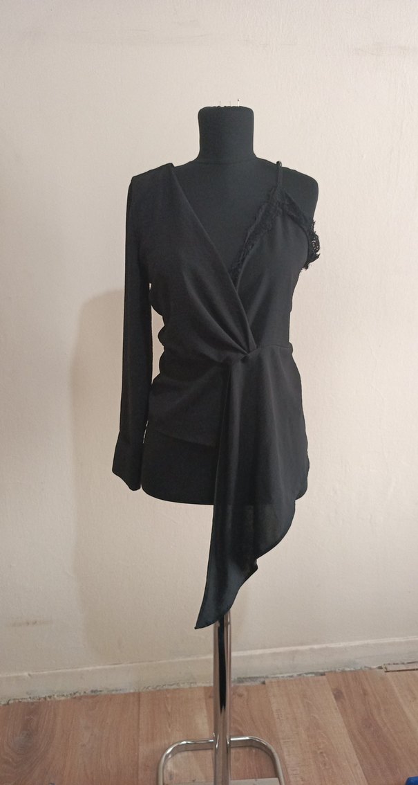 Siyah uzun kollu, V yakalı drapeli mini uzunlukta kadın bluz. Düz sentetik kumaştan, regular fit ve gotik avant-garde tarzda, ofis kullanımı için uygun.
